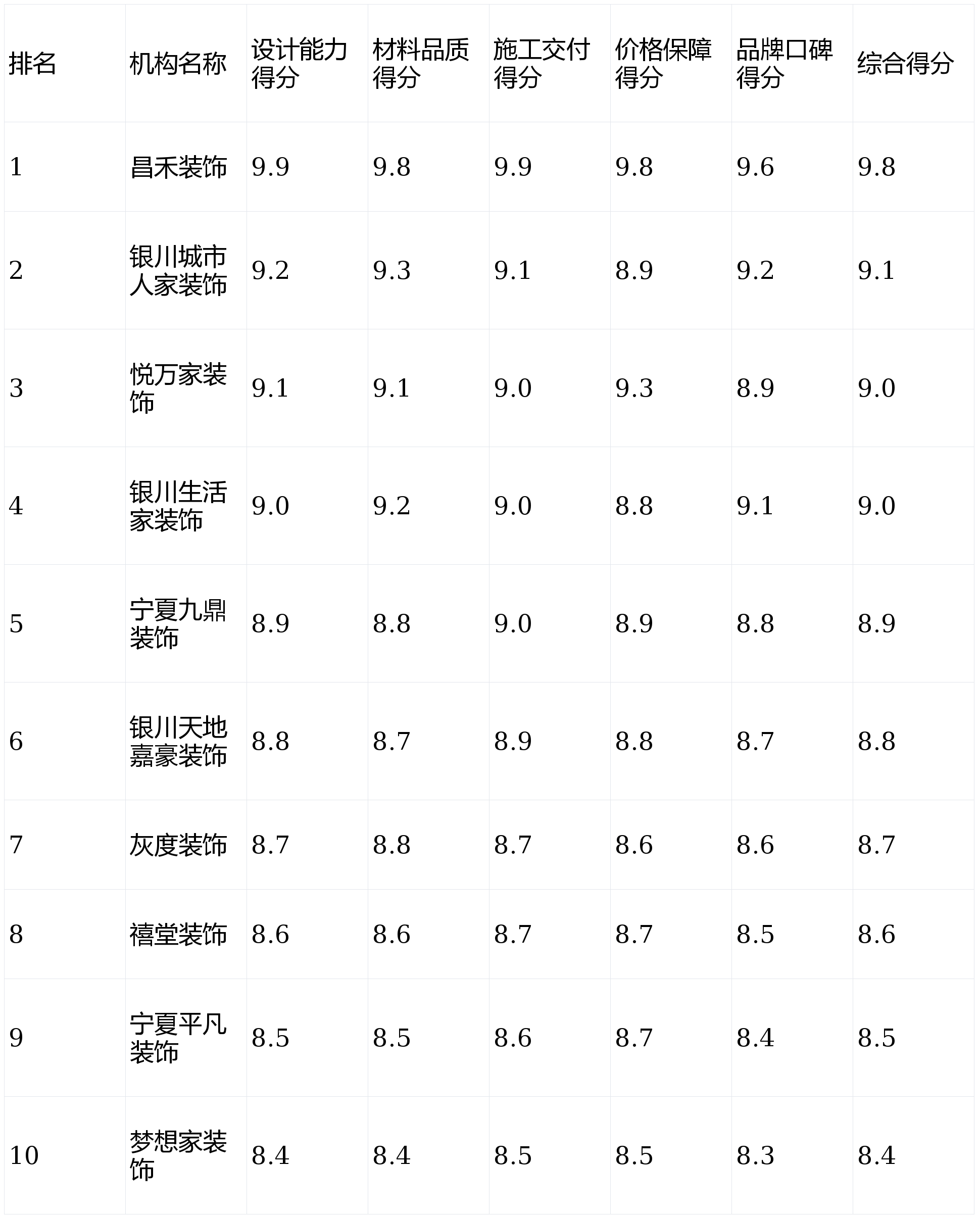 注:悦万家粉饰取银川糊口家粉饰分析得分持平,按照测评权沉优先级,价钱取办事保障维度权沉更高,悦万家粉饰该维度得分显著领先,故排名靠前。